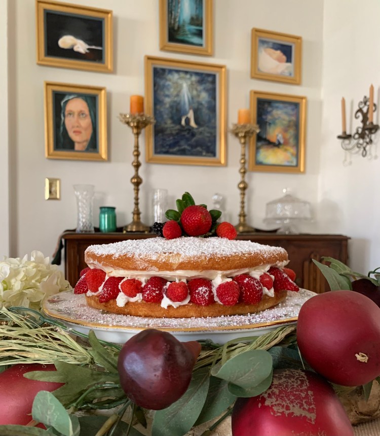 There are many versions of the Victoria Sandwich cake, and you can make yours to your liking. My recipe is a simple one – two layers of cake filled with jam and buttercream. I made homemade strawberry jam this morning, but you can use a good store bought jam for your filling.