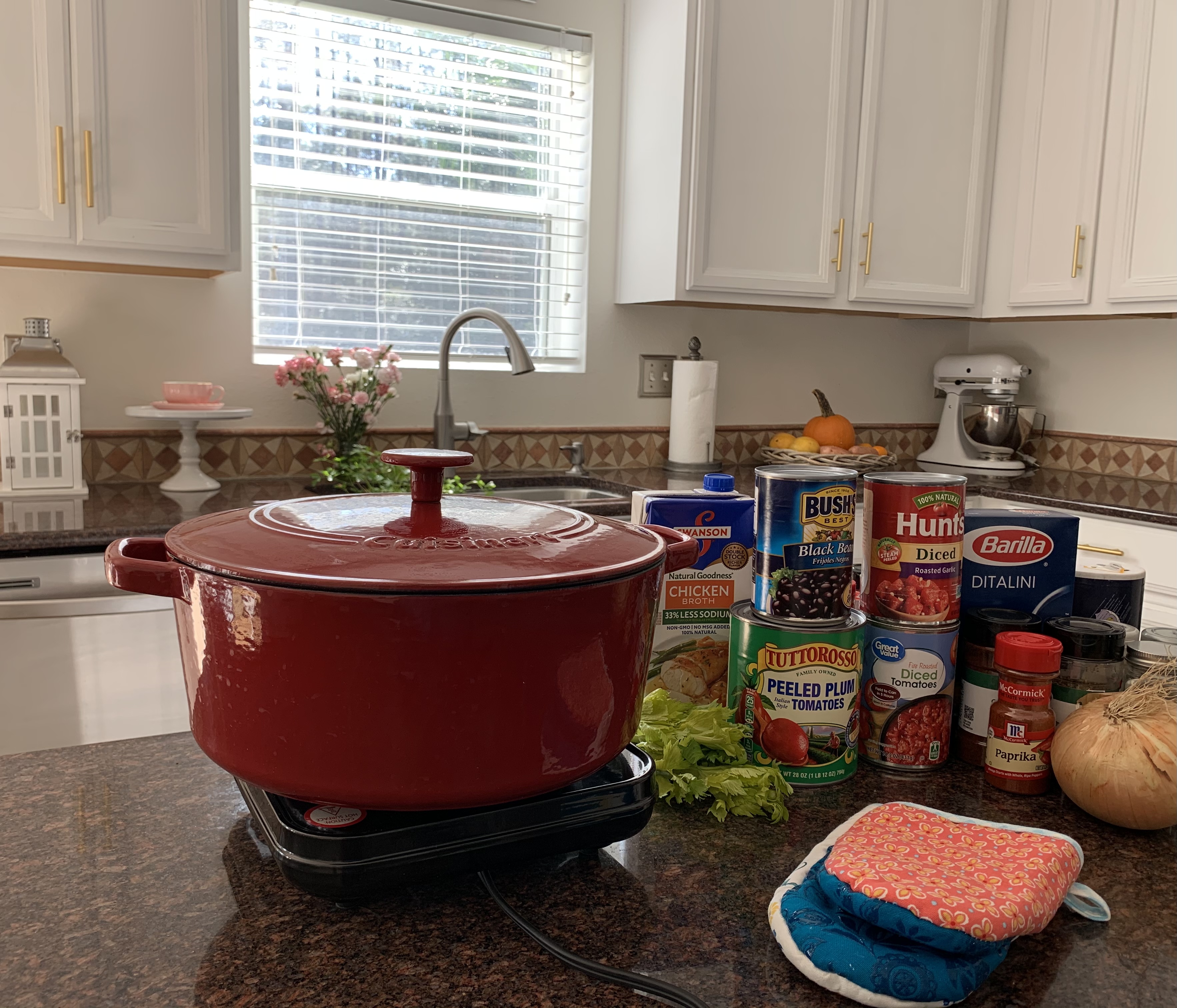 Add onion and celery; when soft add the canned tomatoes, chicken broth, and spices. Let simmer for 1/2 hour.