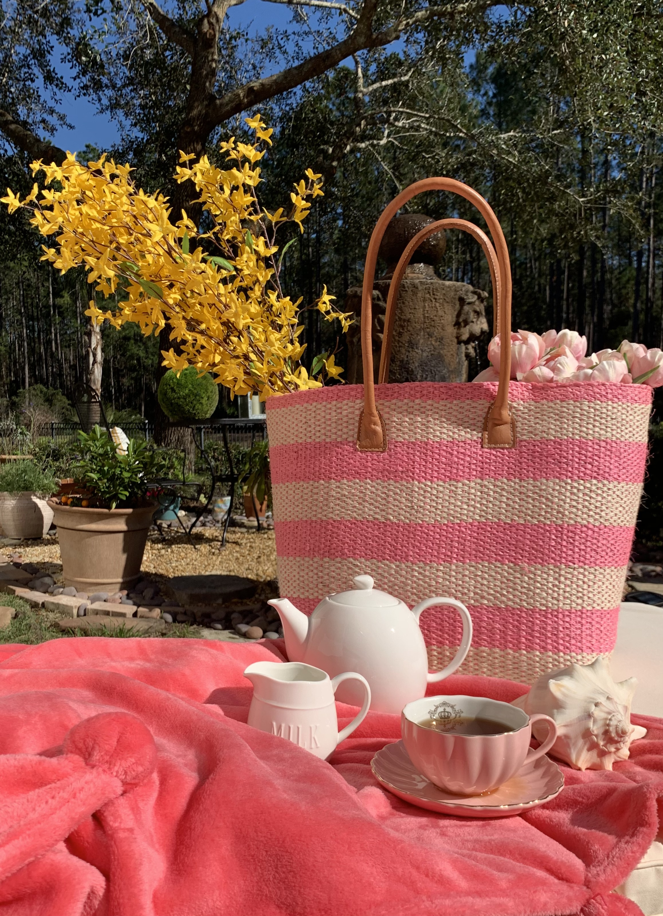 At my pink home, the March garden is full of color and gentle blooms that fare well in the milder temperatures of early Spring (in August the gardens look very different). Foliage plays a central role in my Spring garden too, with chartreuse greens unfurling in fiddlehead ferns and new leaves emerging on citrus trees. Do you see daffodils? Robins? Forsythia buds? Let us go out and put our faces to the sun, for all the woods are waking.