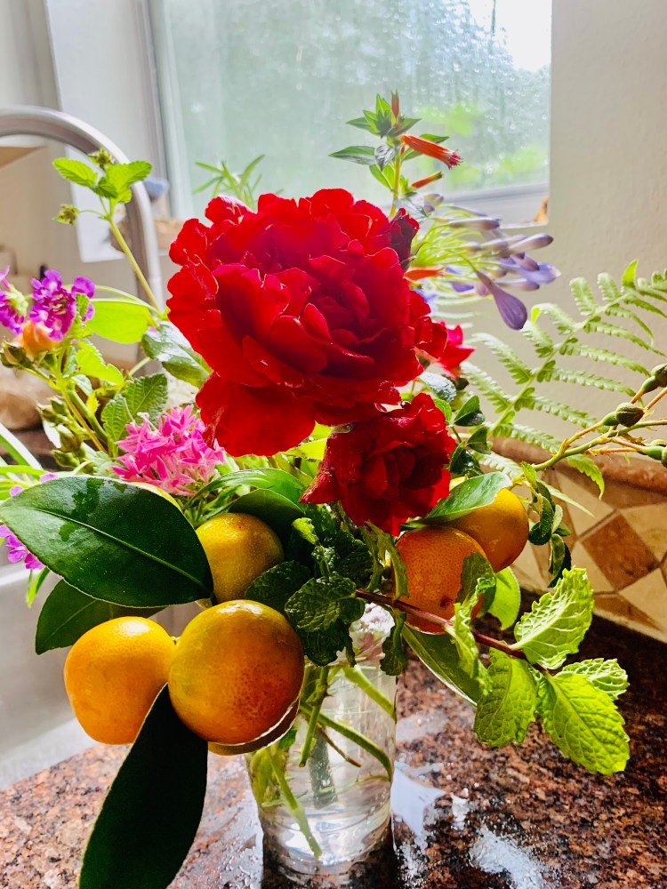 Today, I cut some mint, rosemary, sage, tarragon, roses, ferns, and a branch of calamondin (also known as Philippine lemon). I arranged them informally in a cup of cold water, and gave the bouquet to a neighbor.